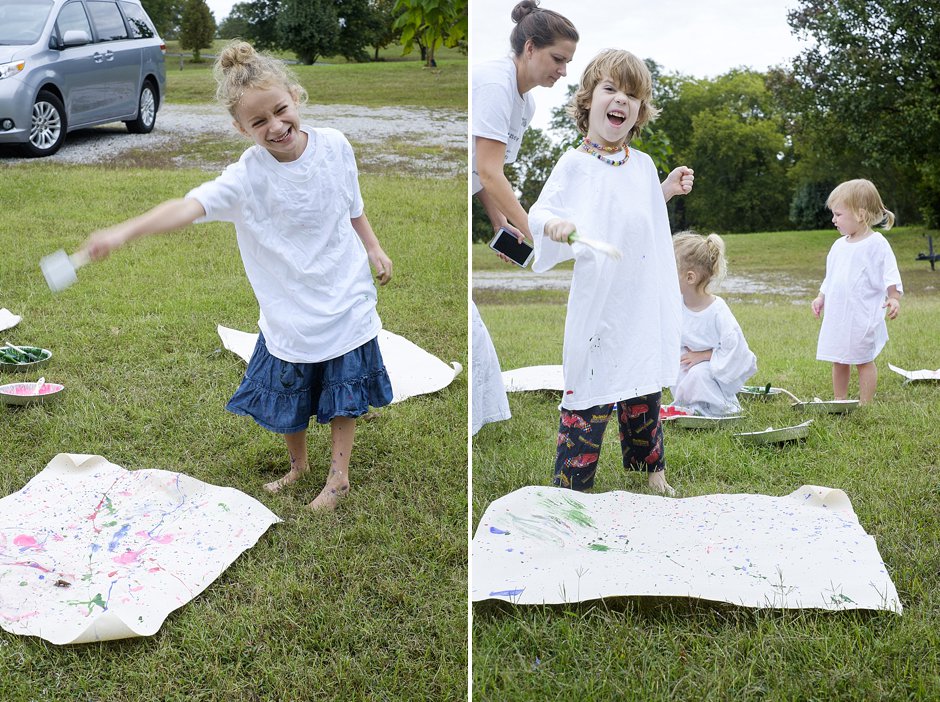 Then we went outside to get painting. Jackson Pollock called his paintings “action paintings” and he did them on unstretched canvas laying on the floor of his studio. We did our best to recreate the experience for some action paintings of our own.