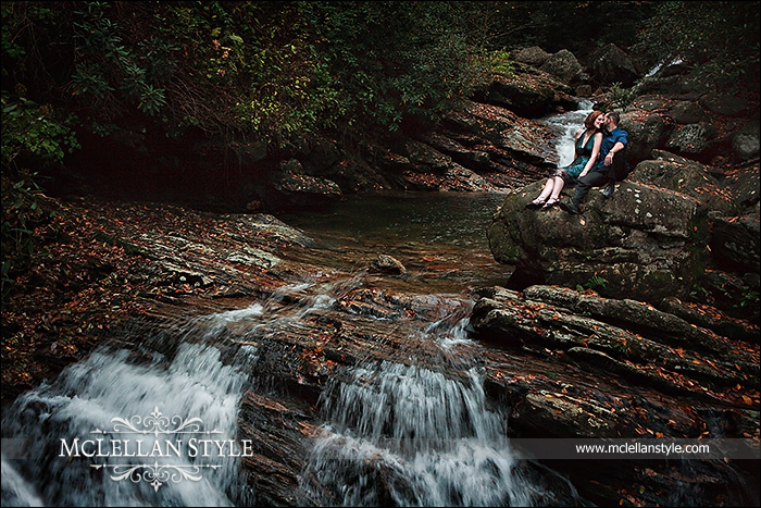 We knew before we ever met them that Sarah and Neil were going to be hilarious and that we would love hanging out with them. They are self-described pickers and thoroughly enjoy picking on each other which Sean and I found completely amusing. They wanted atypical for their session and spent hours scouting various trails around the Asheville Parkway to find the best spots – our kind of clients! :0) Then there’s the flat out openness which I always appreciate and Sarah sent me not one, but two emails describing the nightmares she had where I was a huge diva and wouldn’t photograph them. ha! To top it all off they are either extremely daring or totally nuts because part of what they wanted for the session was to get in the water at the base of a waterfall – in October – in the mountains! I thought for sure that they would change their minds when they stuck a toe in but they not only got in, they got fully submerged in the freezing water! My heroes! :0) Who on earth would ever pull a diva card with that kind of dedication??
